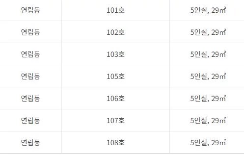 | 연립동 | 블루 101호 | 5명 | 29㎡ | 58,000 | 106,000 | |