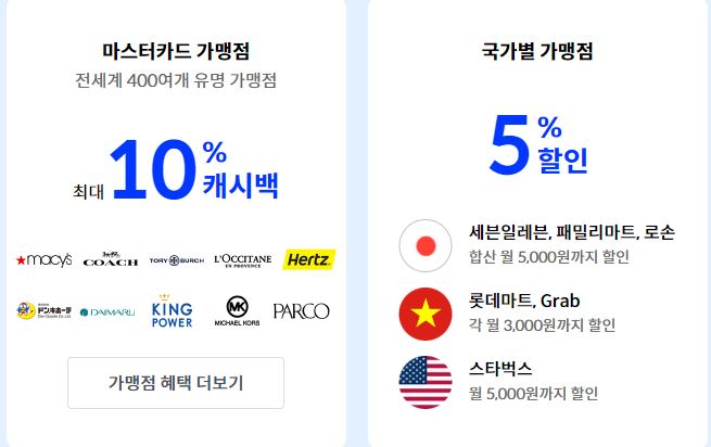 또한 그림과 같이 전세계 400여개의 마스터카드 가맹점에서 최대 10%캐시백 할인을 받을 수 있을 뿐더러 그외 국가별로 5%할인이 가능하죠.