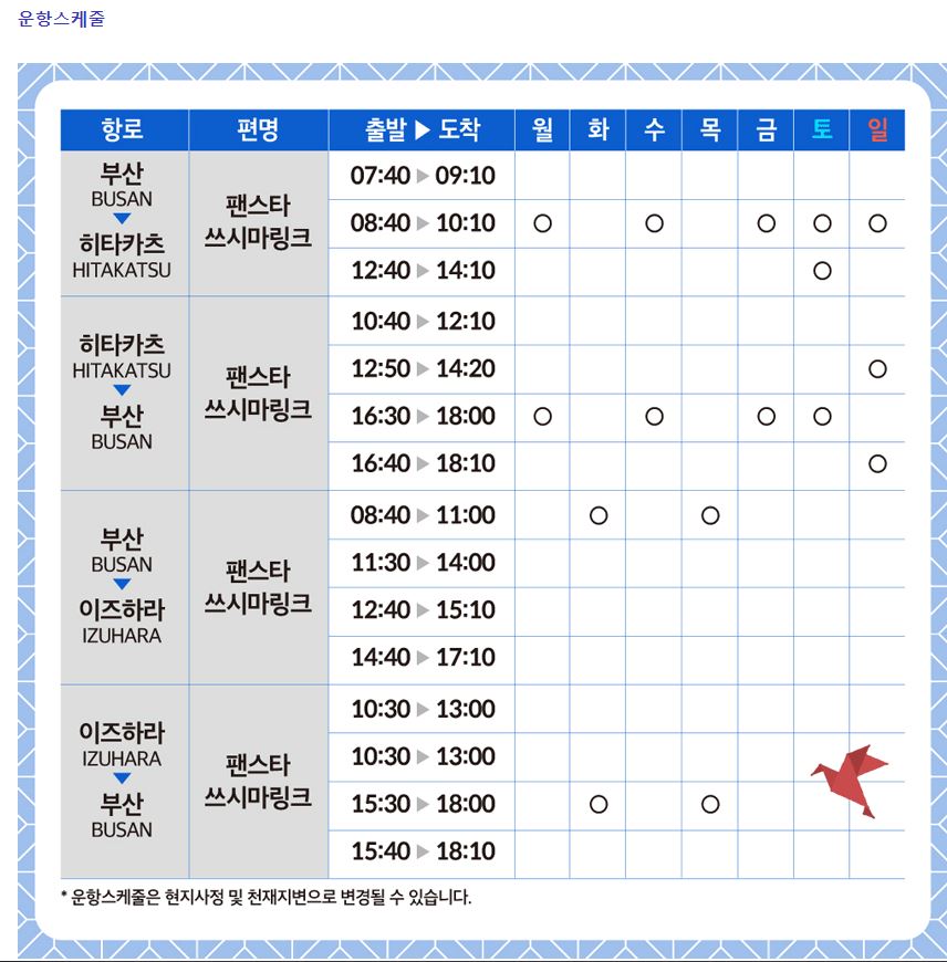 - 부산 <-> 대마도(쓰시마) 배편 노선 2곳(히타카츠, 이즈하라)