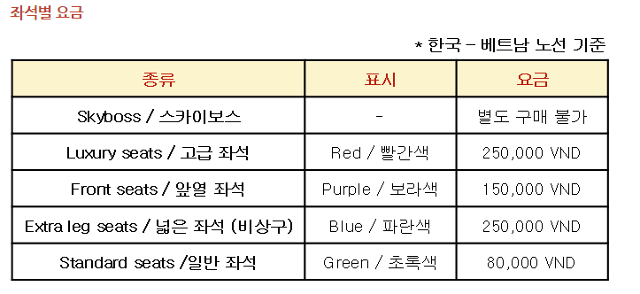 비엣젯항공의 고급좌석은 위 좌석배치도 중 빨갛게 표시된 부분입니다. 일반석보다 ....