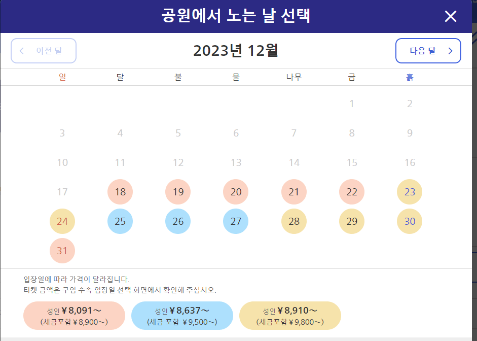 | 성인(12세 이상) | 8,600엔 | 9,400엔 | 9,900엔 | 10,400엔 |