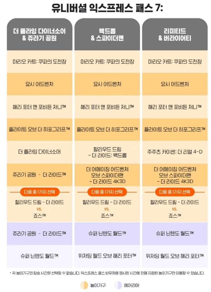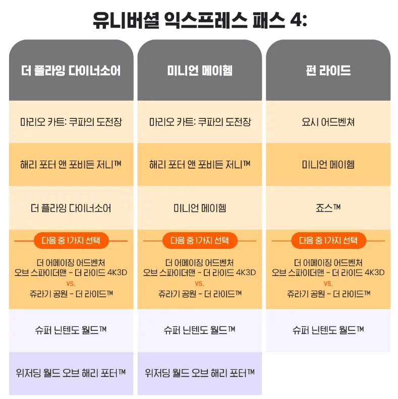 미니언라이드 4와 해리포터, 닌텐도 확약권 패키지의 경우 여러 곳의 어트랙션을 들리고 싶은 분께 추천드리고, 다이너소......