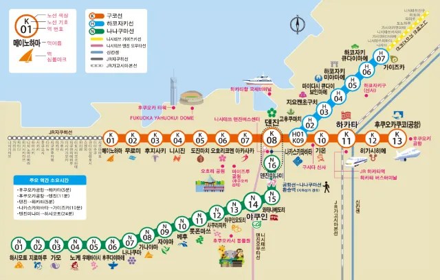 그림을 보시면 오른쪽 끝에 후쿠오카공항이 보이실거에요 여기서 왼쪽으로 2칸만 가면 우리가 가려고하는 하카타역에 도착할 수 있습니다......